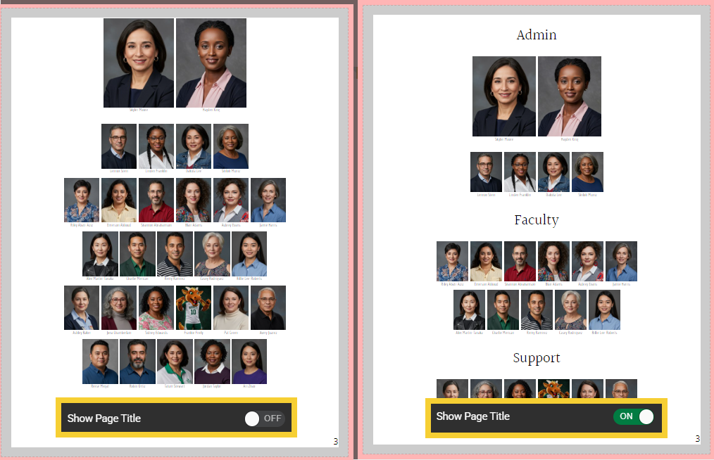 Turning the page title off / onBy default, every portrait group will display a title to identify it. If no title is required, click the toggle switch to the off position, then click Update Layout at the bottom of the page. ![]() Consult the Portrait Title Customization article to learn more. | ![]() |