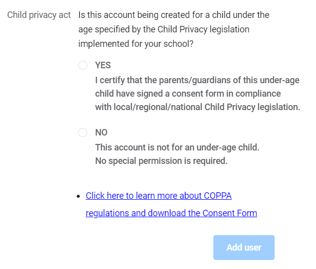 If COPPA (Child Online Privacy Protection Act) limitations have been set up for your book, you will need parental permission to create an account for children under the age of 13. Please read the Children’s Online Privacy Protection Act article for more information and downloadable permission forms. | |