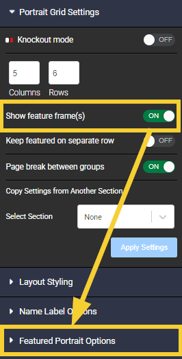Turn on the Show featured frame(s) toggle to show an additional advanced drawer -- Featured Portrait Options.